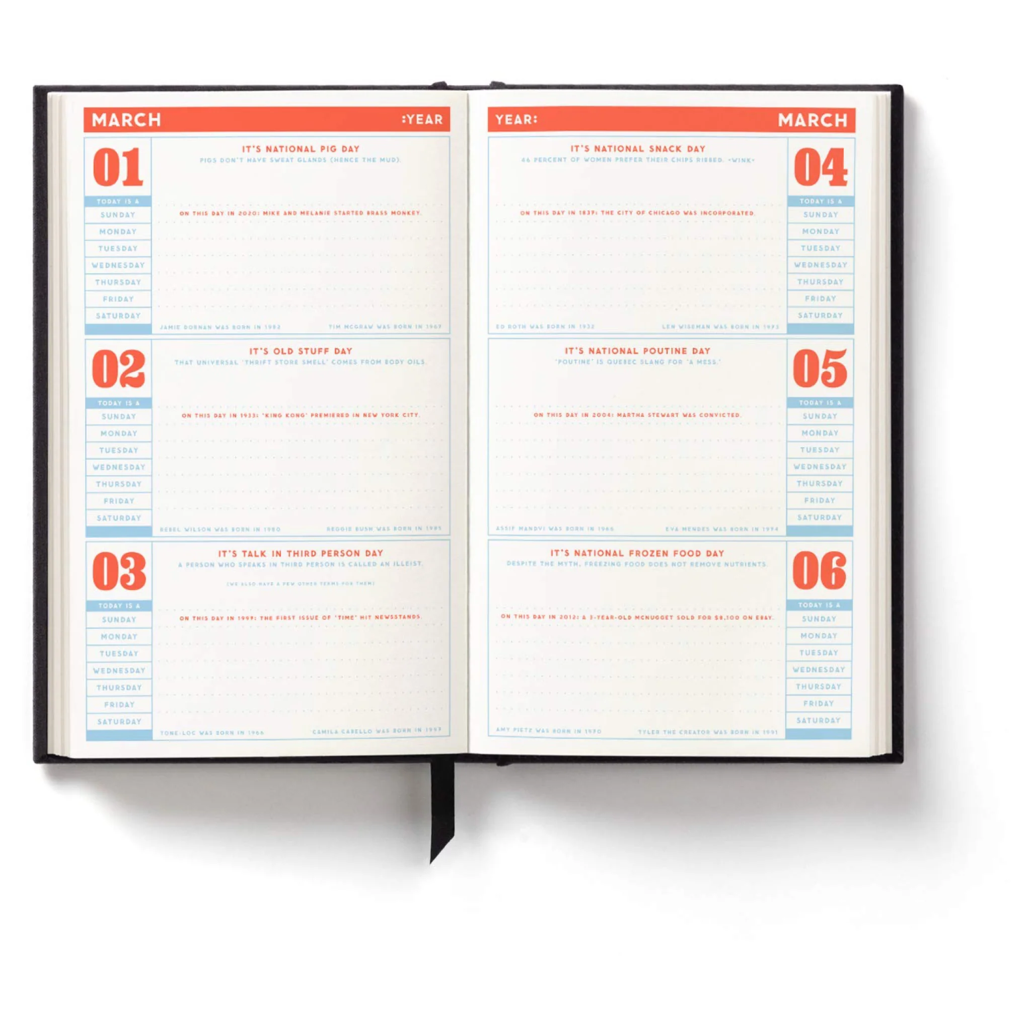Discover the Hidden Agenda Undated Mini Planner, crafted with a stylish cloth-bound cover by Brass Monkey. Far from being merely undated, this planner is filled with dates, fixed holidays, celebrity birthdays, and unique trivia like daily random holidays. A simple way to personalize your schedule, all you need to do is fill in the year and corresponding weekdays. Whether it's a planner for today or for the future, even up until 2054, this mini daily planner offers flexibility with a twist of fun. It's not just a planner; it's an invitation to live life your way.