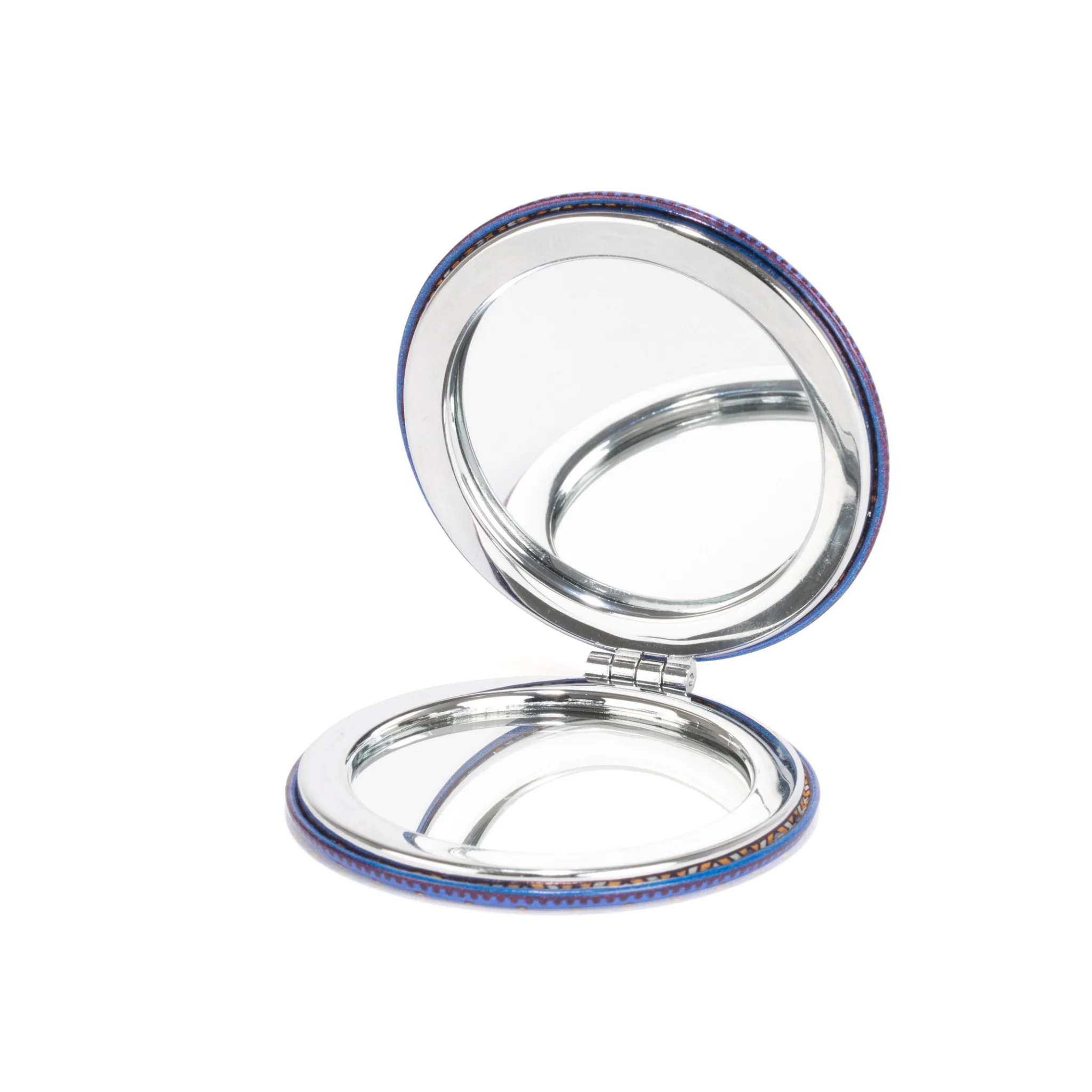 This slim profile compact mirror flips open to show one regular mirror and one 2X magnification. Four mesmerizing decal patterns. Small size is great for your purse or makeup bag.